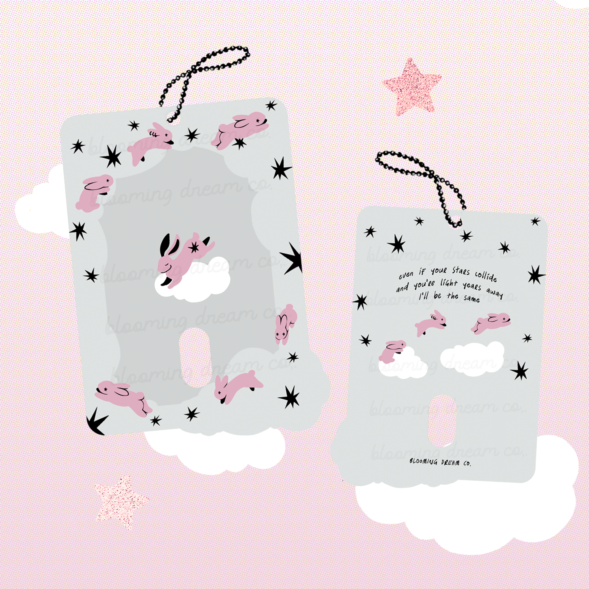 A cloud-shaped photocard holder inspired by our love for our star boy, Jungkook! Pink rabbits dance among the clouds, with lyrics from 'Please Don't Change.'
