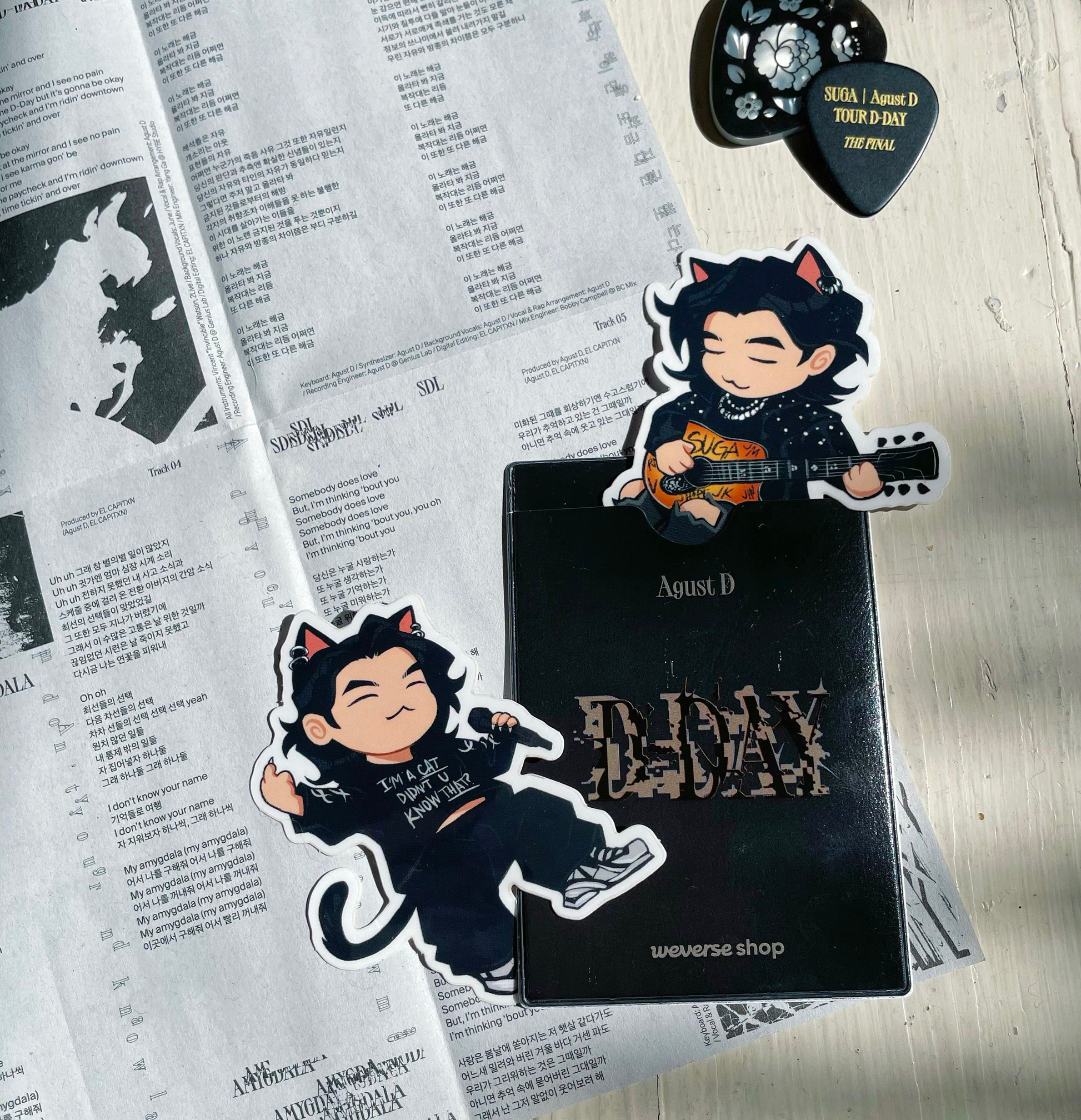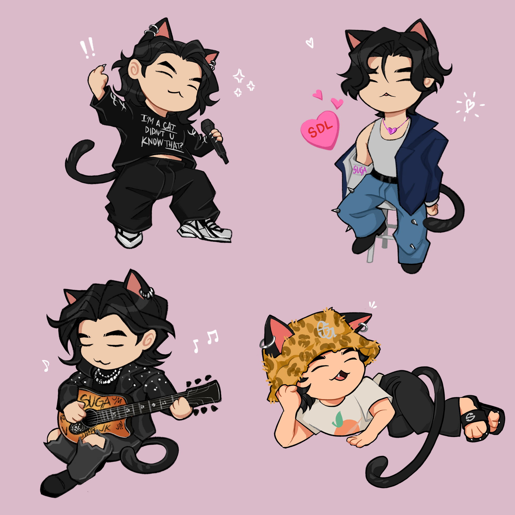 Say hello to our 'Min Meow' series. We wanted to capture our favorite iconic moments and eras that span his whole career as Agust D, SUGA, and Min Yoongi, but... extra cute. Kitty style. You can also find matching acrylic charms in our store!